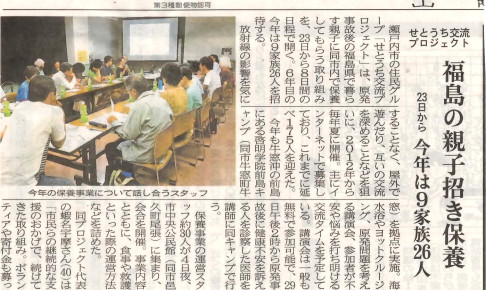 せとうち交流プロジェクト保養までのこり2週間! いよいよの大詰めを迎える中で、保養前最後の会議の様子を山陽新聞の大河原さんがまとめてくださいました。 いつも、丁寧な取材に感謝です! 以下に、記事全文を掲載します。 福島の親子招き保養 23日から…
