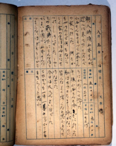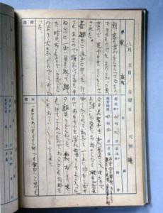 (略)午後 小西(こにし)さんと泳ぎに行った。私はちっともよう泳がないのに、皆んなよく浮くなと思ふとなさけなかった。今日は大へんよい日でした。これからも一日一善と言ふことをまもらうと思う」