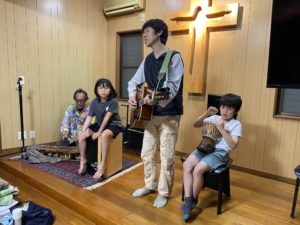 自然発生的にスタッフ吉田さんがギターを片手に歌い出す。カメちゃんが木琴、三浦がピアノ、夜迦がカホン、ホノトがパーカッションでいつのまにかバンド結成♫♪